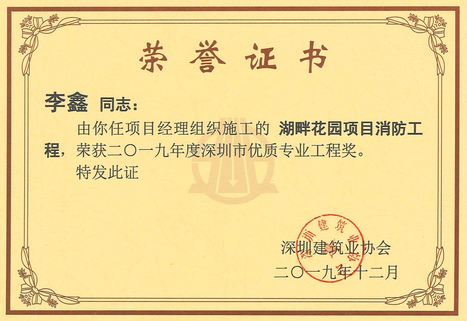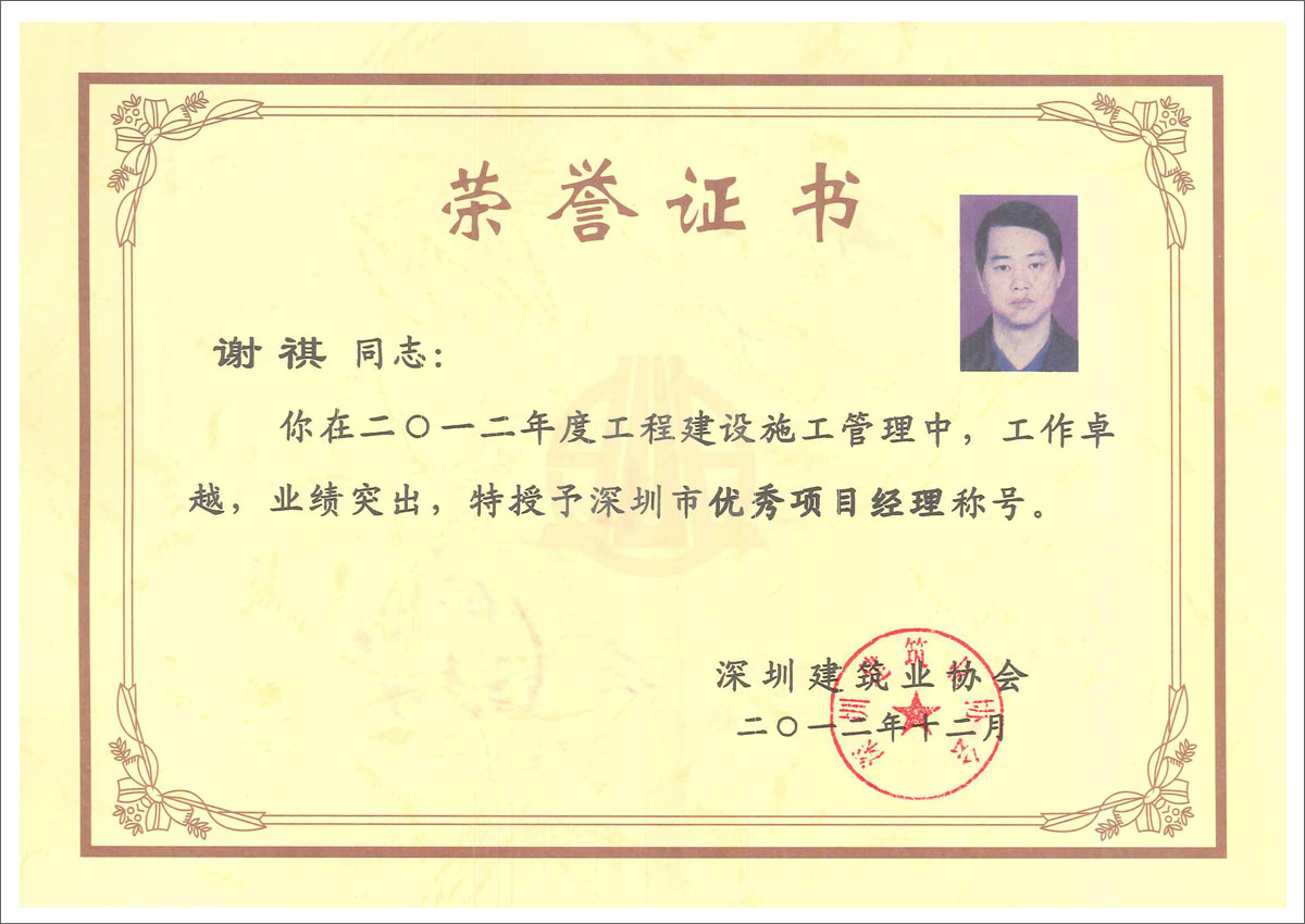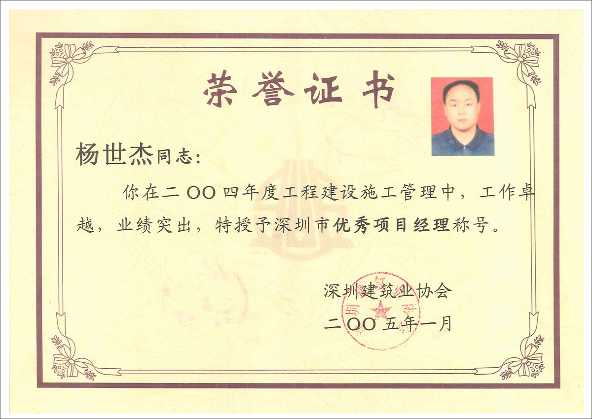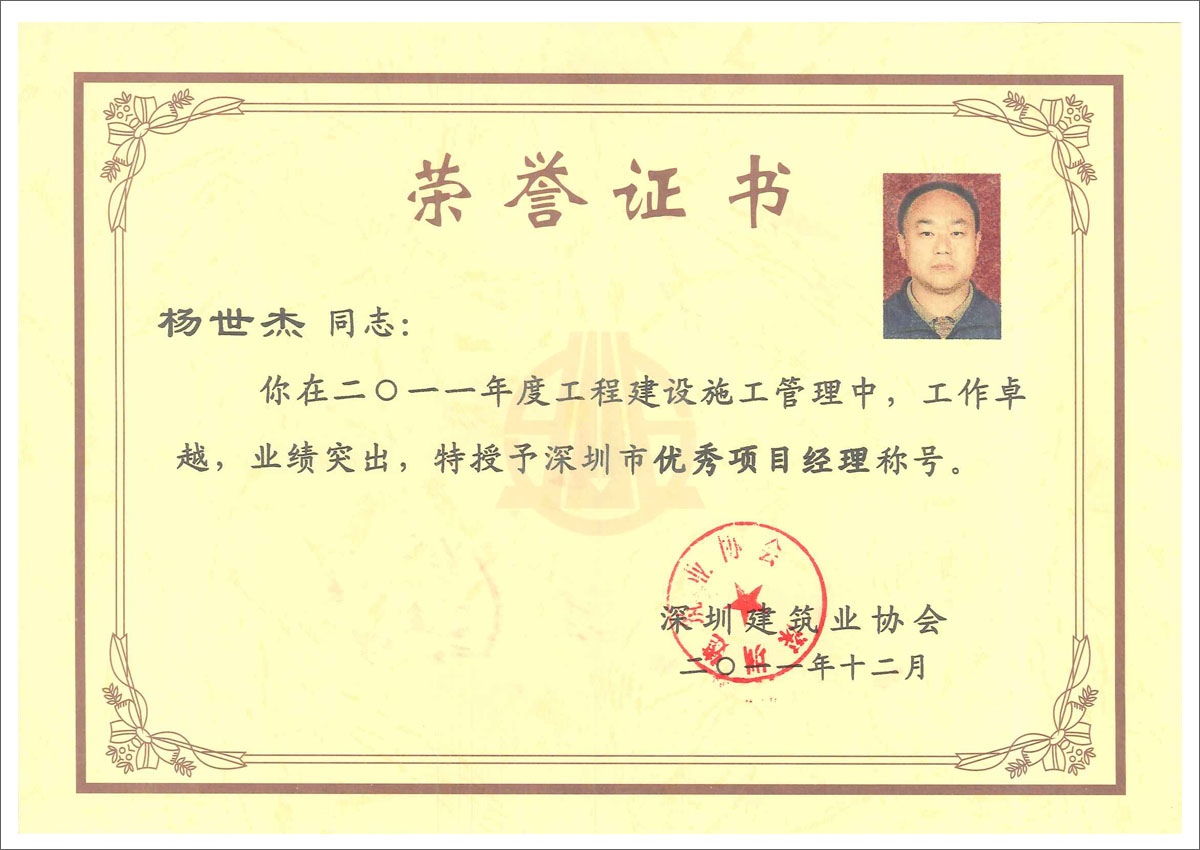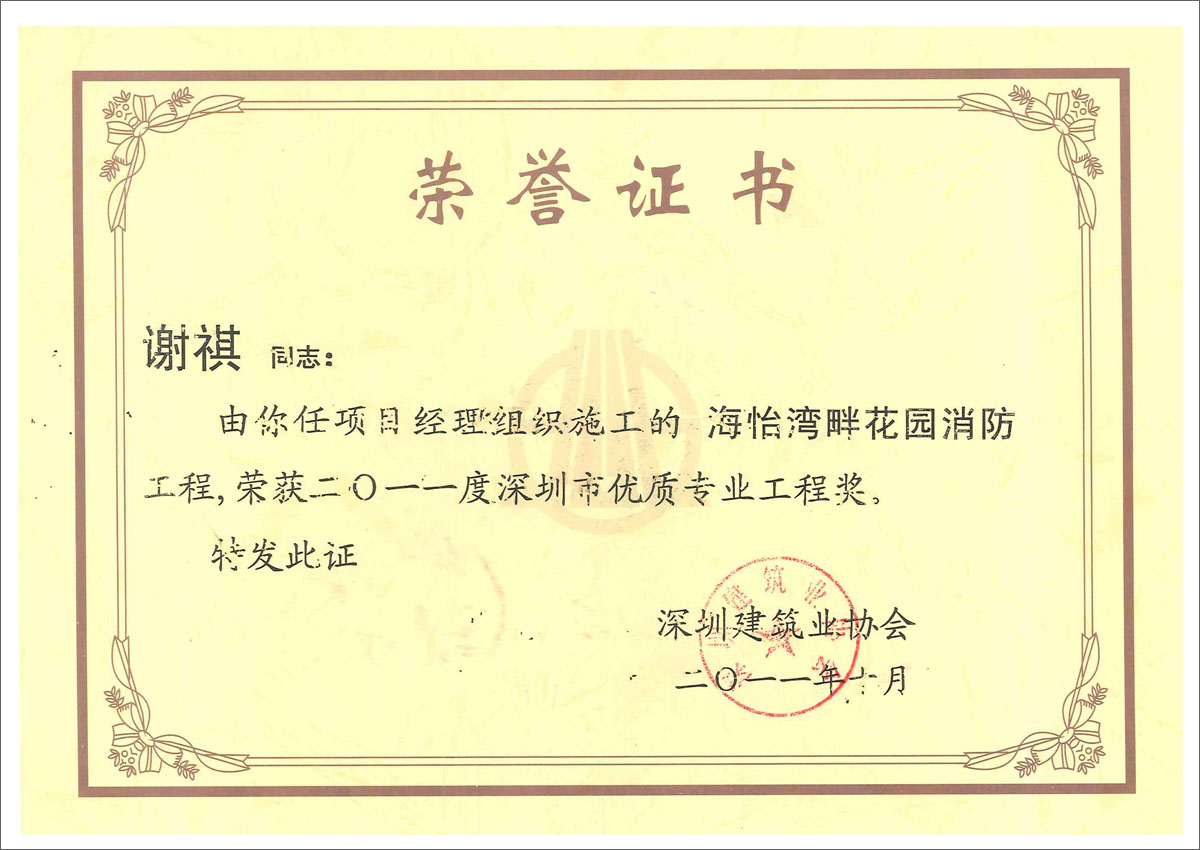 楊世杰 華潤(rùn)深圳灣國(guó)際商業(yè)中心項(xiàng)目消防設(shè)施安裝工程I標(biāo)段之C標(biāo)段(柏寧花園)工程優(yōu)質(zhì)專業(yè)工程獎(jiǎng)