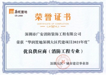 2022年6月,華潤置地深圳大區(qū)正式發(fā)布深圳大區(qū)2021年度戰(zhàn)略品類供方定級結(jié)果,深圳廣安消防榮獲優(yōu)良供應(yīng)商(消防工程專業(yè))。