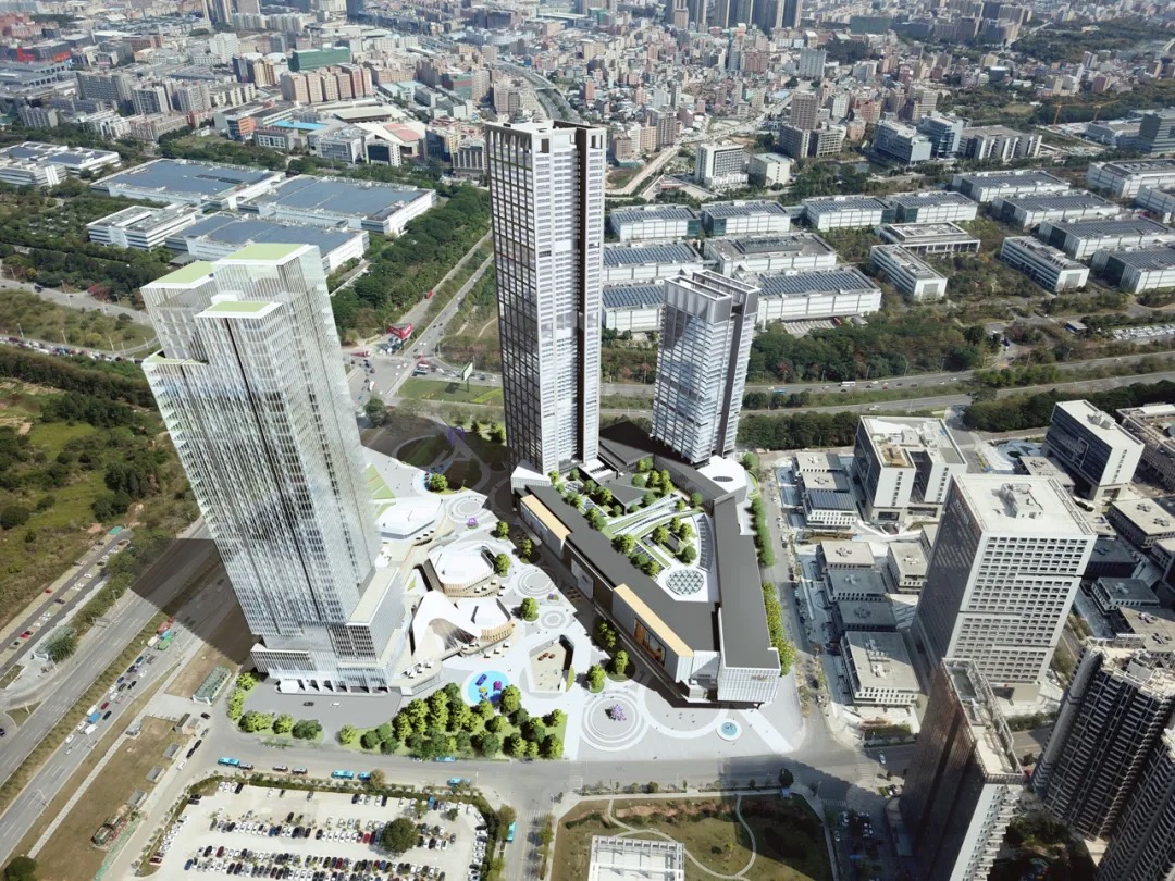位于松山湖新城大道,總投資30.2億元。項目占地4.41萬平方米,總建筑面積約35萬平方米,接駁松山湖北站TOD交通樞紐,業(yè)態(tài)包含商業(yè)、寫字樓、酒店及公寓,并以“盒子+公園+街區(qū)”的形式呈現(xiàn)。其中,裙樓商業(yè)地上五層、地下一層,兩棟塔樓高度分別為240米、130米。